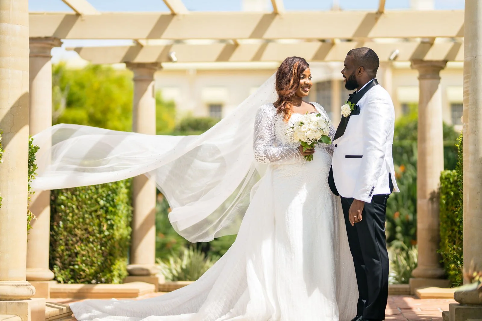 The morning started with excitement and anticipation as Mariatou and Ken got ready surrounded by their closest friends and family. Mariatou’s preparation suite was a vision of elegance, with flowers everywhere, complementing her two gorgeous wedding dresses on display. The bride’s first look was in a stunning white gown, later changing into two additional dresses, including a traditional Nigerian outfit. Her bridesmaids, wearing matching Gele headpieces, helped her with final touches, setting the tone for a day steeped in culture and love.